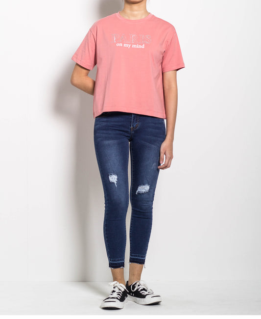 Women Short Sleeve Tee With Rhinestone - Pink - H0W782
