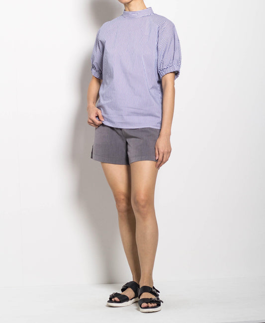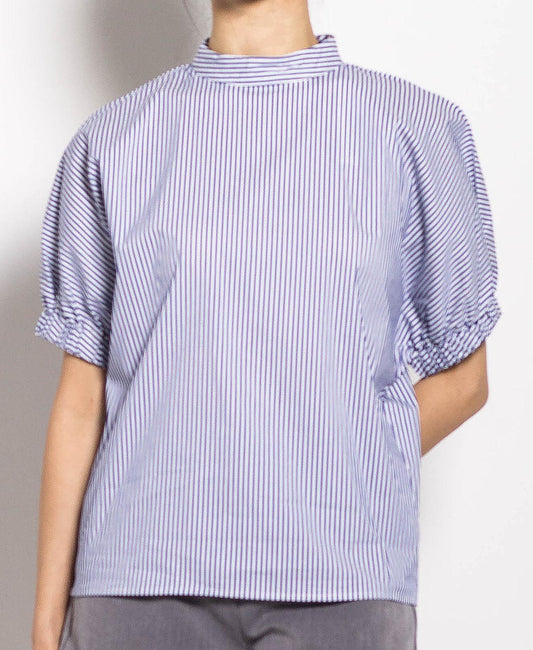 Women Short Sleeve Stripe Puff Sleeve Blouse - Blue - H0W736