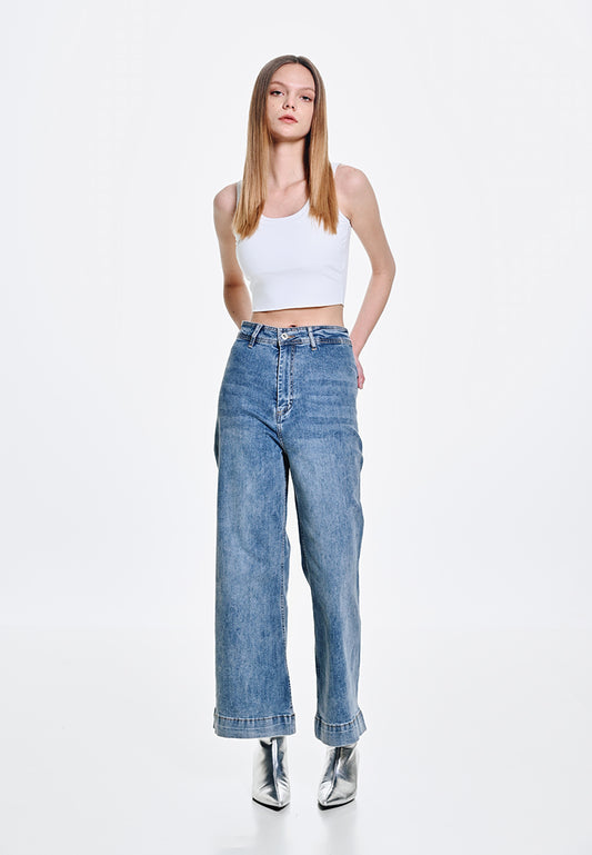 Women Wide Leg Long Jeans - Blue - 410050