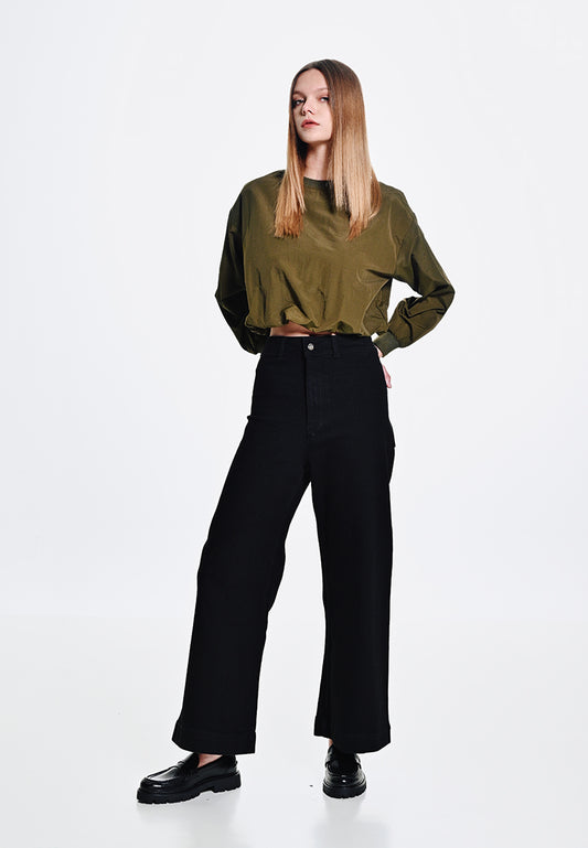 Women Wide Leg Long Jeans - Black - 410048