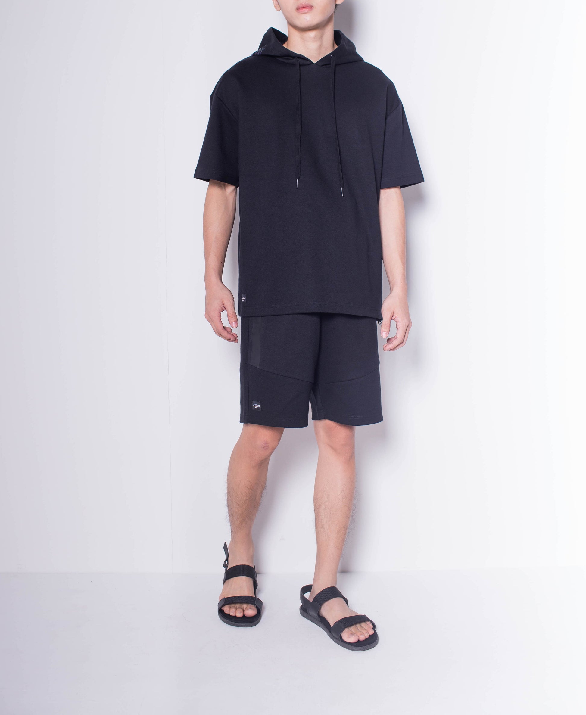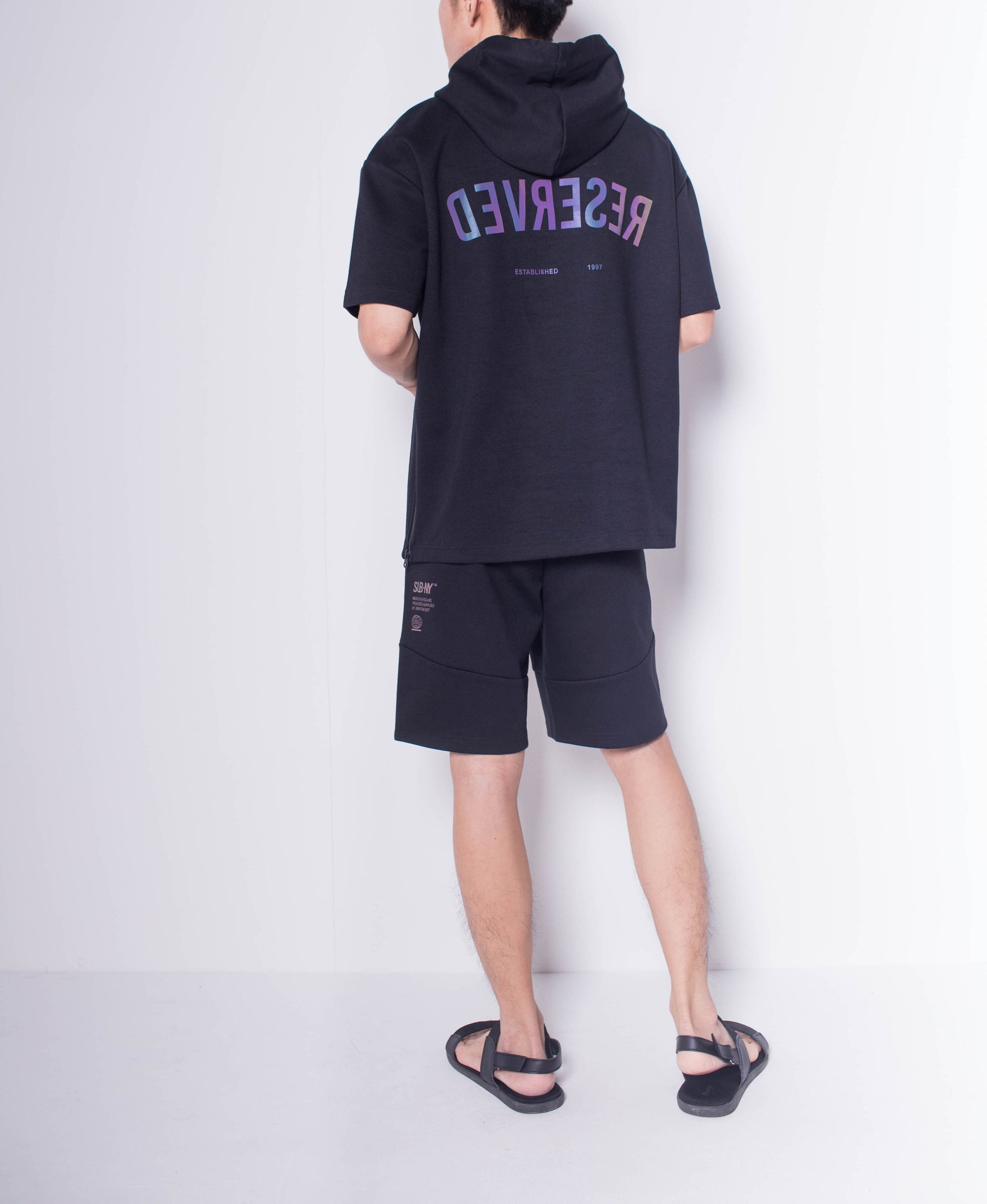 Men Short Sleeve Oversized Sweatshirt Hoodie With Reflective Prints - Black - H0M646