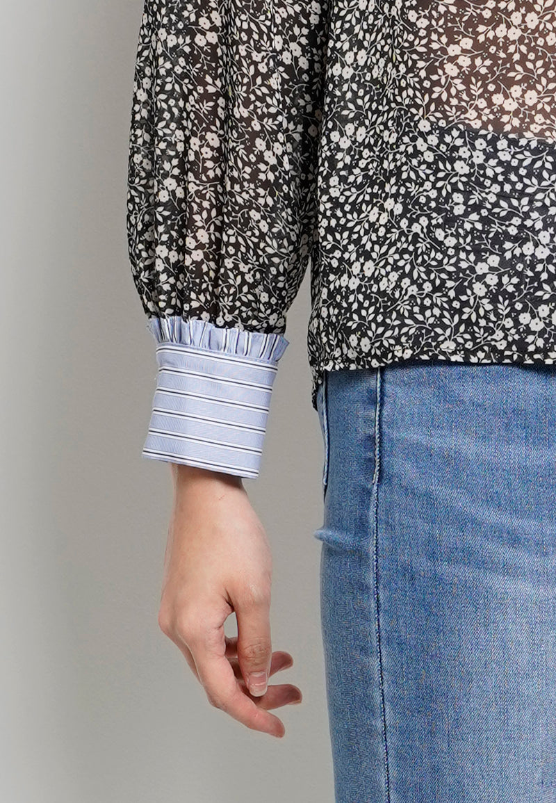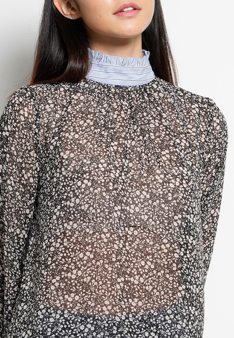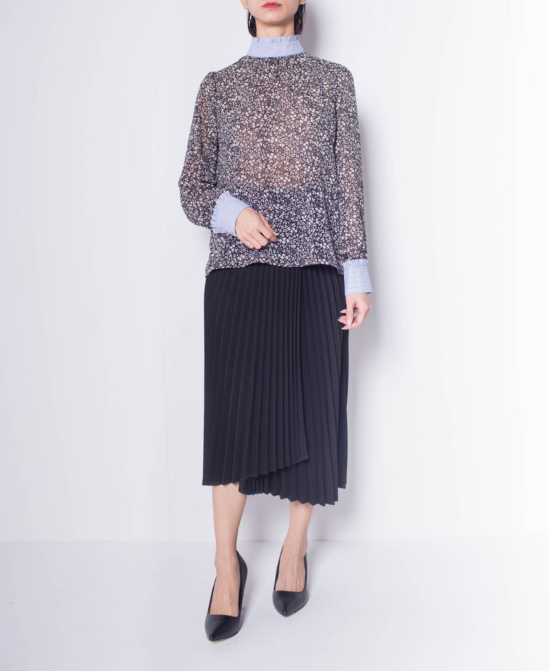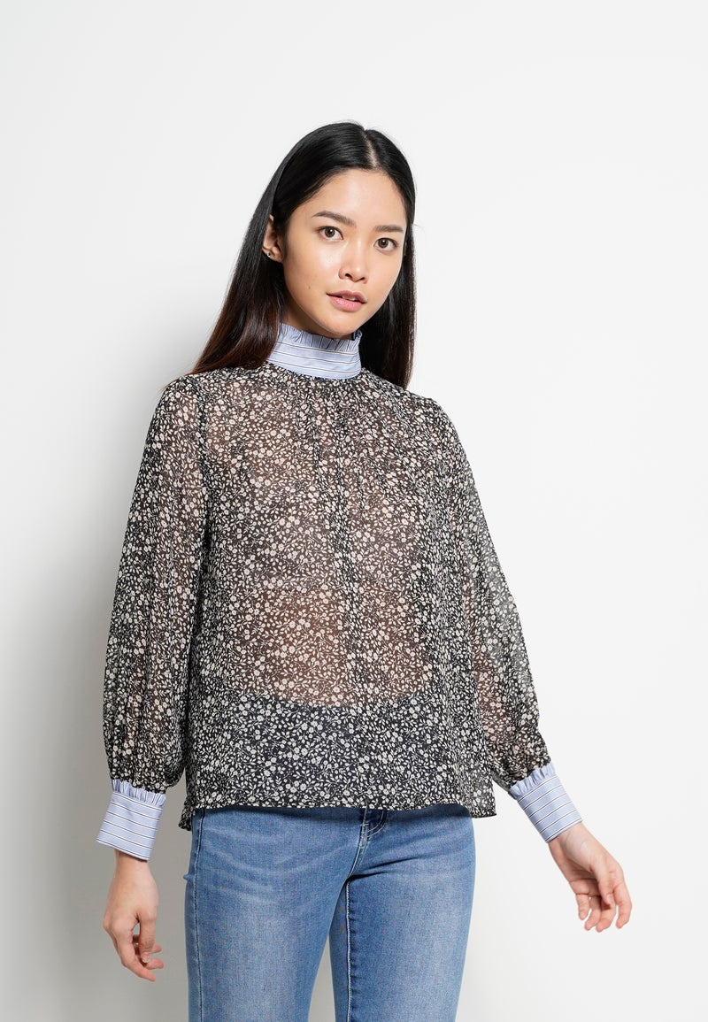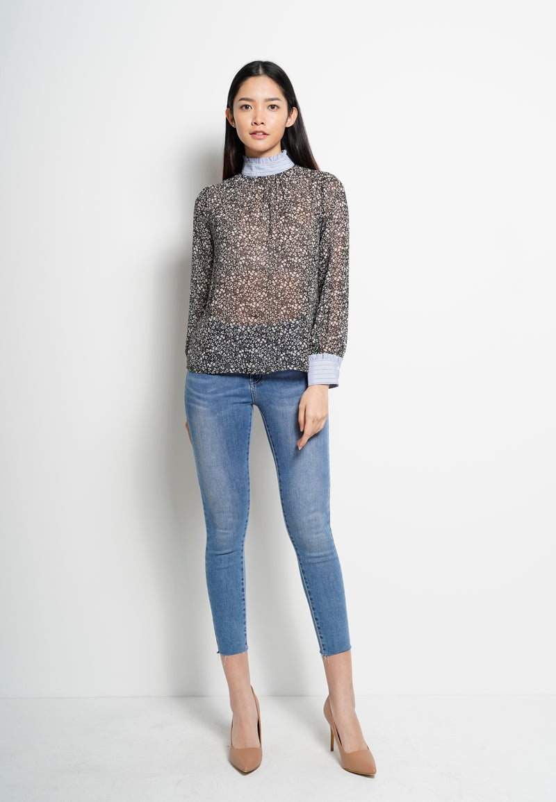 Women Frills Neck Long-Sleeve Blouse - Black - H0W750