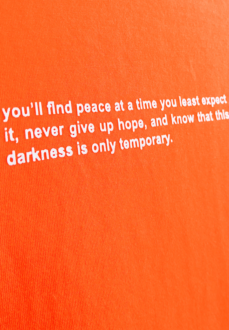 - Slogan with " you'll find peace at a time you least expect it , never give up hope , and know that this darkness is only temporary."