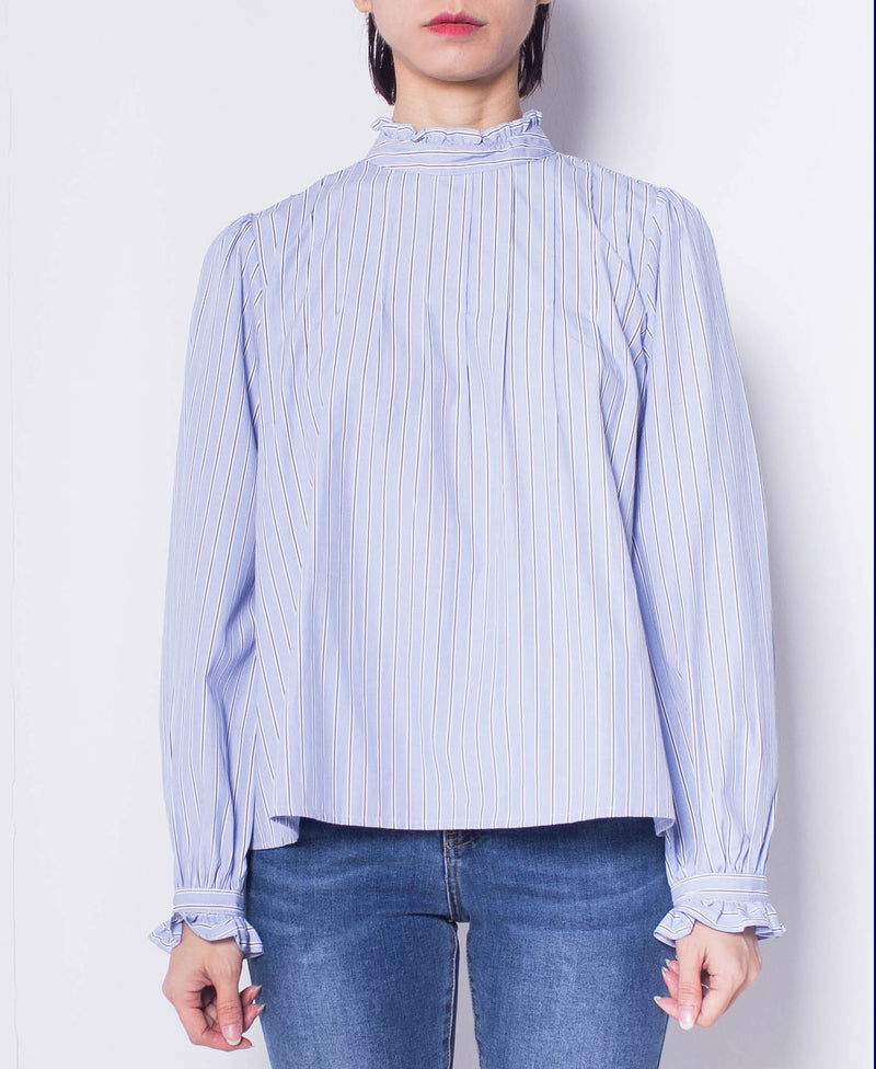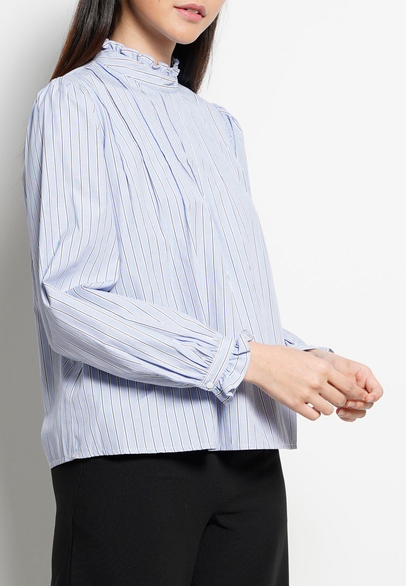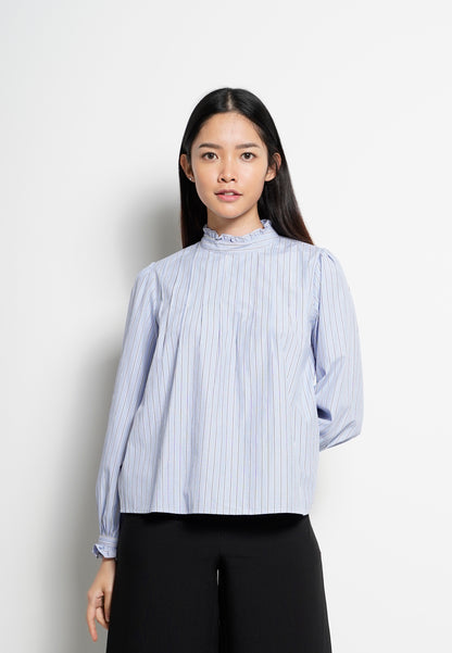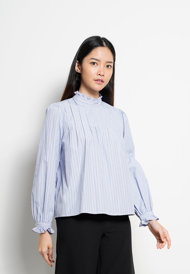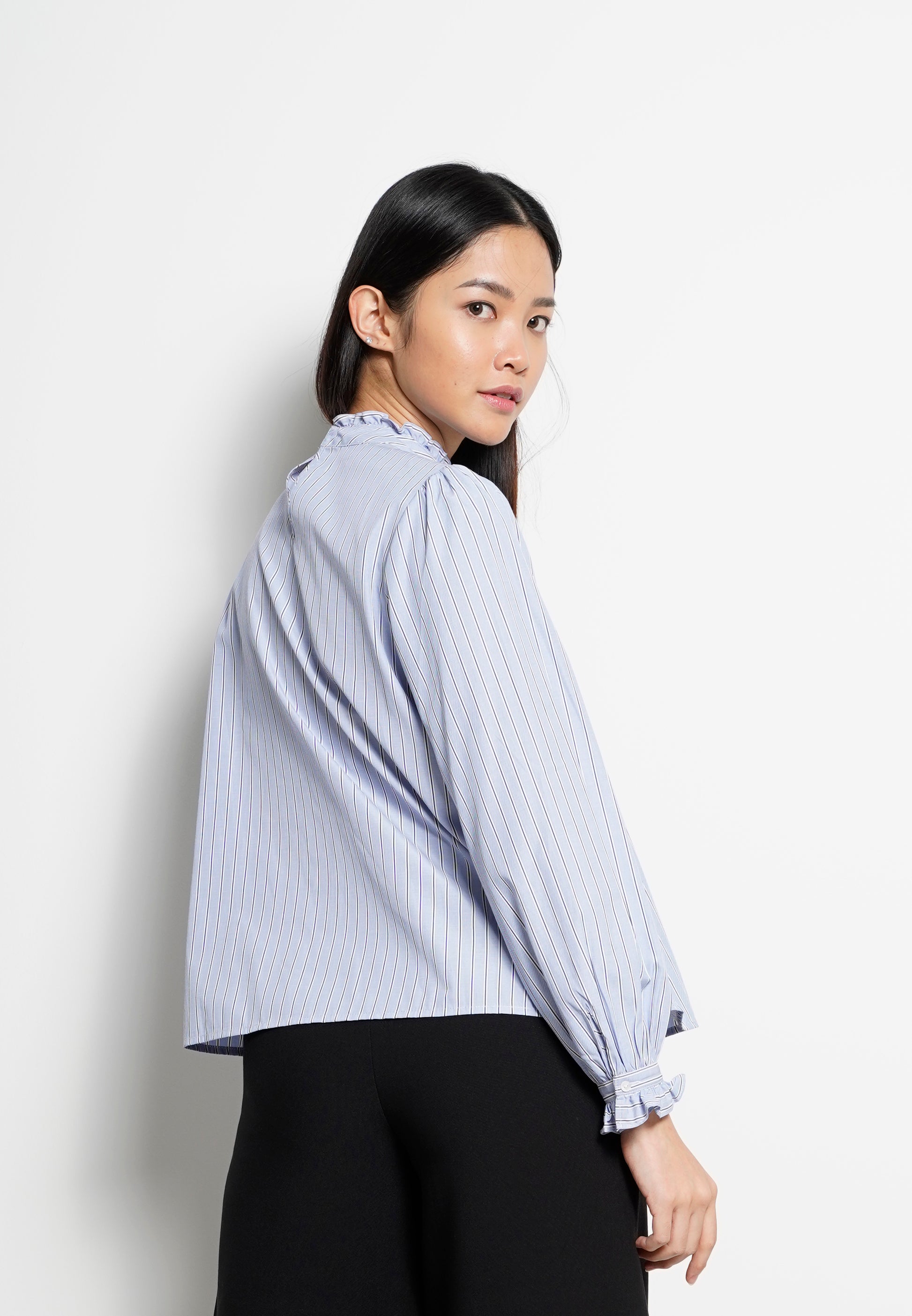 Women Striped Frill Neck Long-Sleeve Blouse - Blue - H0W745