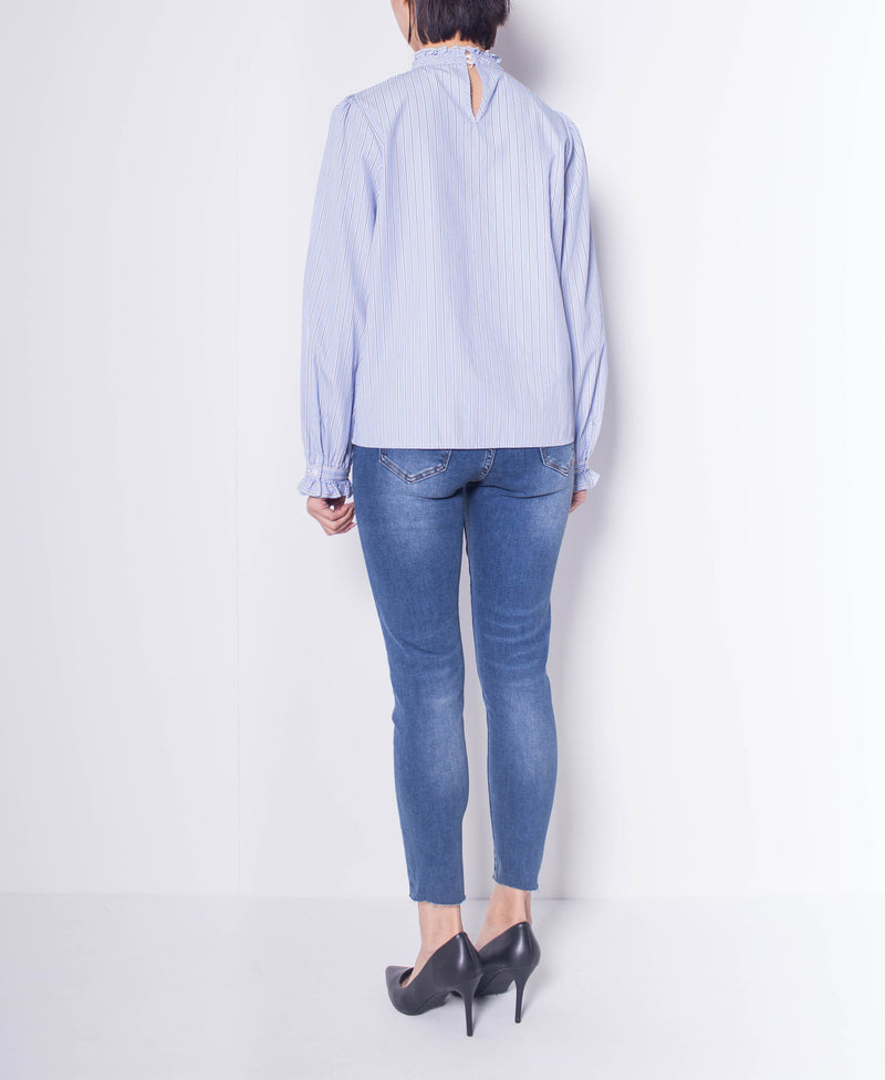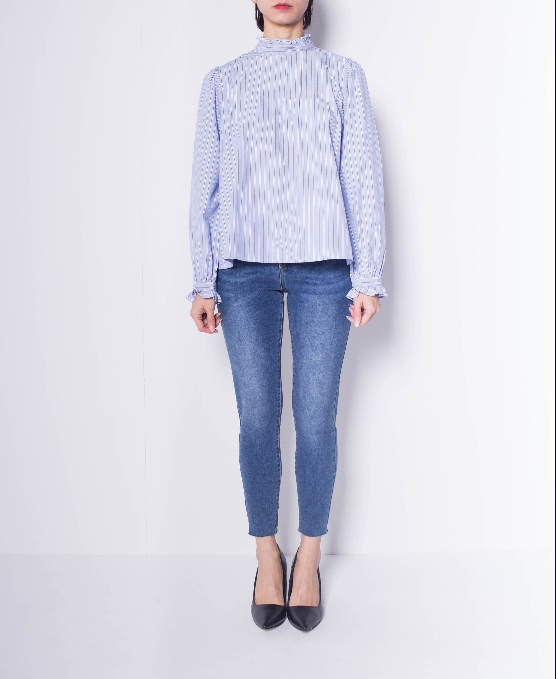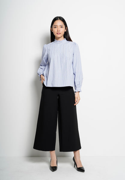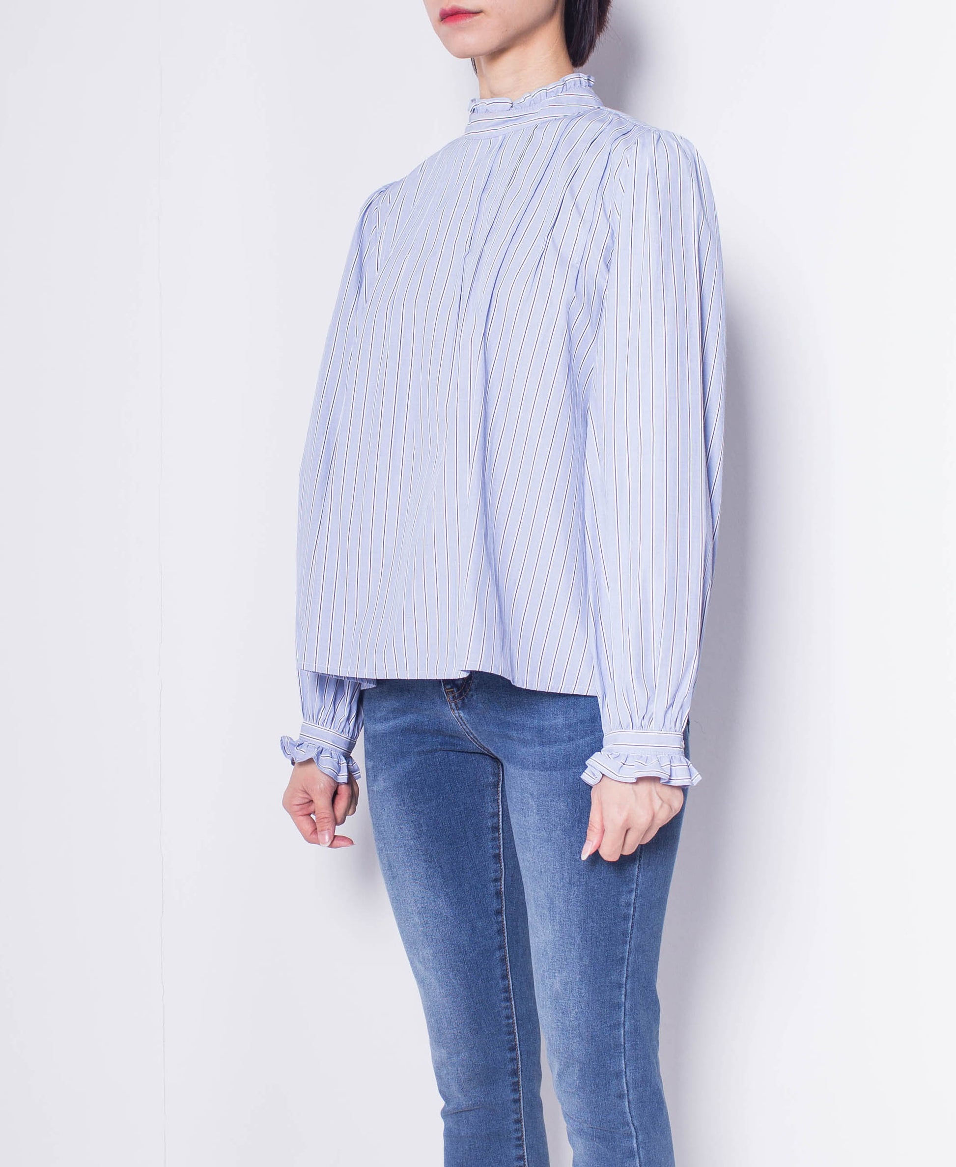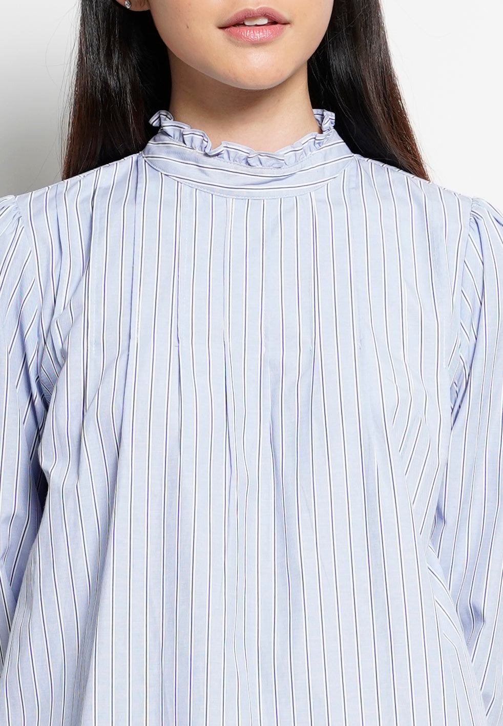 Women Striped Frill Neck Long-Sleeve Blouse - Blue - H0W745