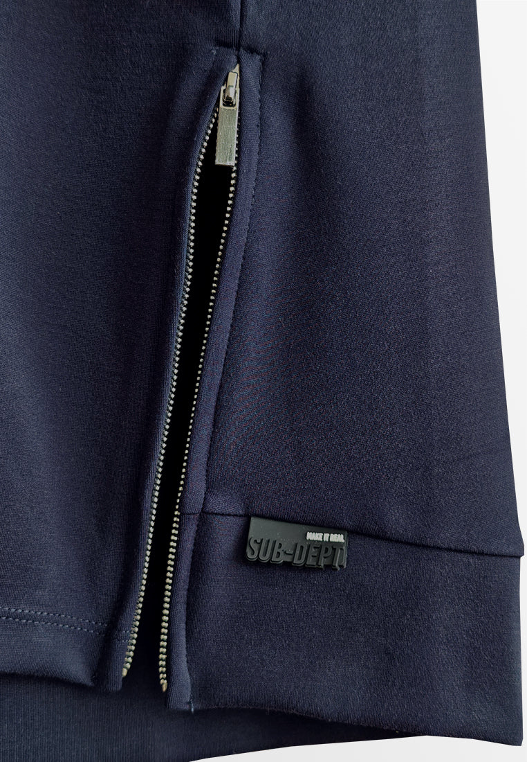 - Design: Round neck, midi length, and hem zip detail for a polished finish